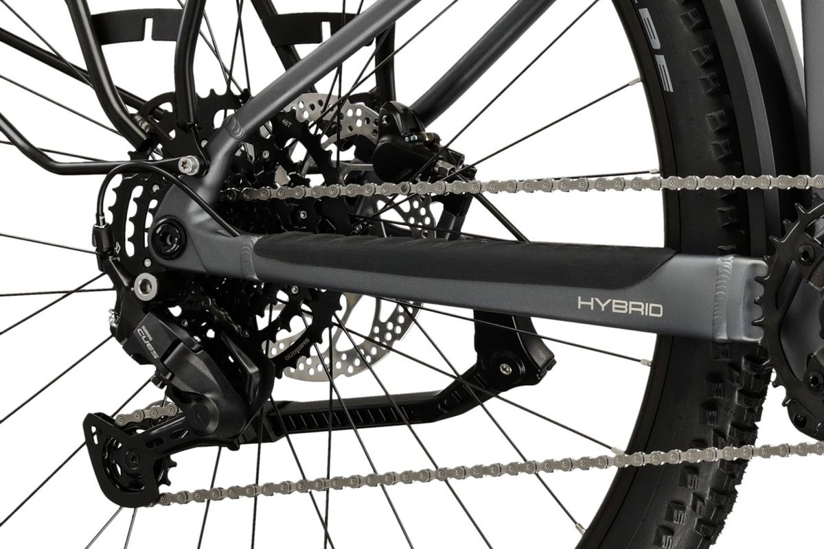 A hajtás- és váltórendszer túrázásra hangolt: komponensei a Shimano CUES U4000 1×9 váltórendszer, 11–46T tartományú CUES LG300 kazetta és Shimano LG500 lánc. Ez egy jó kompromisszum: egyszerű kezelést tesz lehetővé, mégis megvan a könnyű fokozat meredekhez és a tempósabb áttétel síkra, és az LG platformnak köszönhetően a tartóssággal és megbízhatósággal sem lesz gond a, nyomatékos, rendkívül erős motorhajtás mellett. A fékezésért a megbízható, könnyen szervizelhető Shimano MT200 hidraulikus tárcsafékek felelnek 180 mm-es Shimano RT30 tárcsákkal. Ez különösen e-bike tömegnél és csomaggal jelent nagy előnyt.