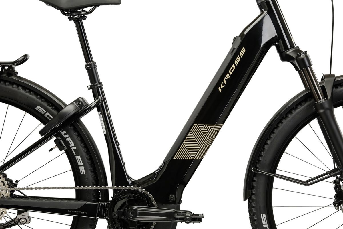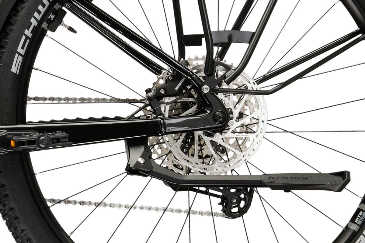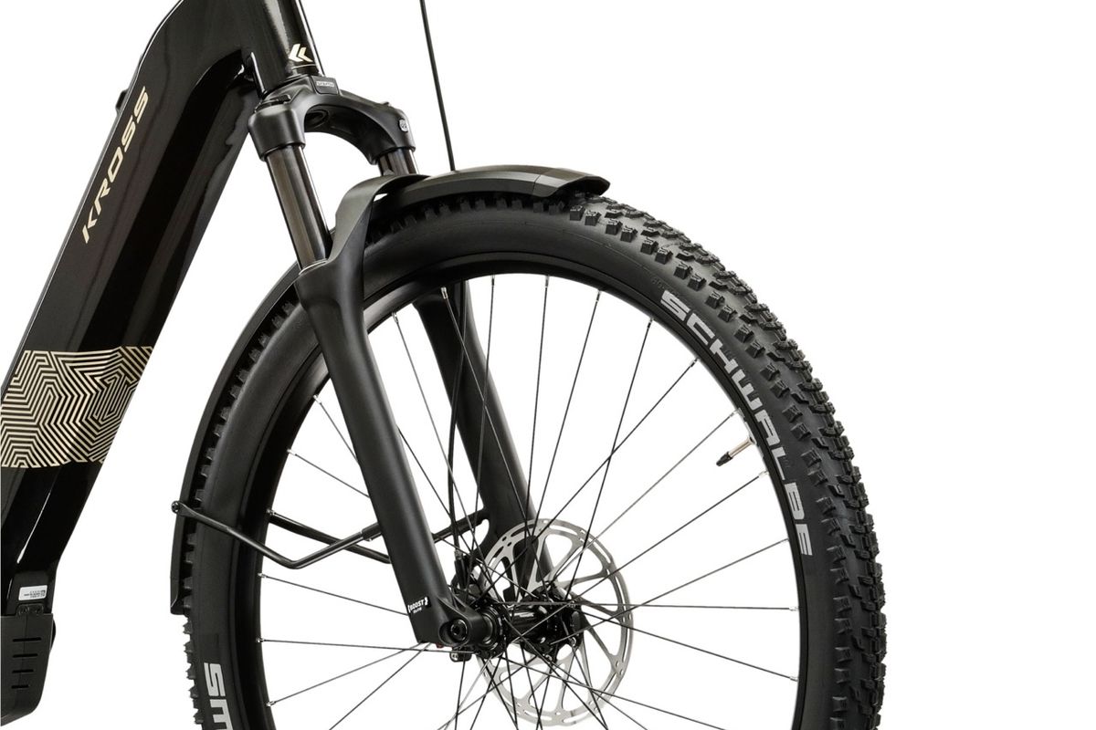 A hajtás- és váltórendszer prémium színvonalú Shimano Deore M6100 típus, 1x12 fokozattal, amely finom váltások közti lépéseket és minden eddiginél nagyobb áttételi tartományt biztosít. Rendkívül megbízható és pontos rendszert alkot. A fékezést a Kross mérnökök a magas színvonalú SRAM DB4 hidraulikus tárcsafékekre bízta 180 mm-es SRAM CenterLine tárcsákkal. Négydugattyús rendszerről van szó, ami elképesztő fékhatást nyújt, ami különösen e-bike tömegnél és csomaggal jelent nagy előnyt. A távirányítással működő dropper nyeregszár teszi teljessé a komfortot és a kontrollt. Végezetül a “SUV” jelleg nem csak marketing: a Kross integrált világítást, a masszív csomagtartót és a teljes sárvédőszettet biztosít. Mindennek köszönhetően a bringa ugyanúgy alkalmas napi közlekedésre, mint túrázásra, és nem kell külön vadászni ezeket a prémium kiegészítőket.