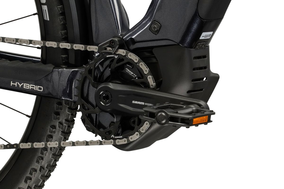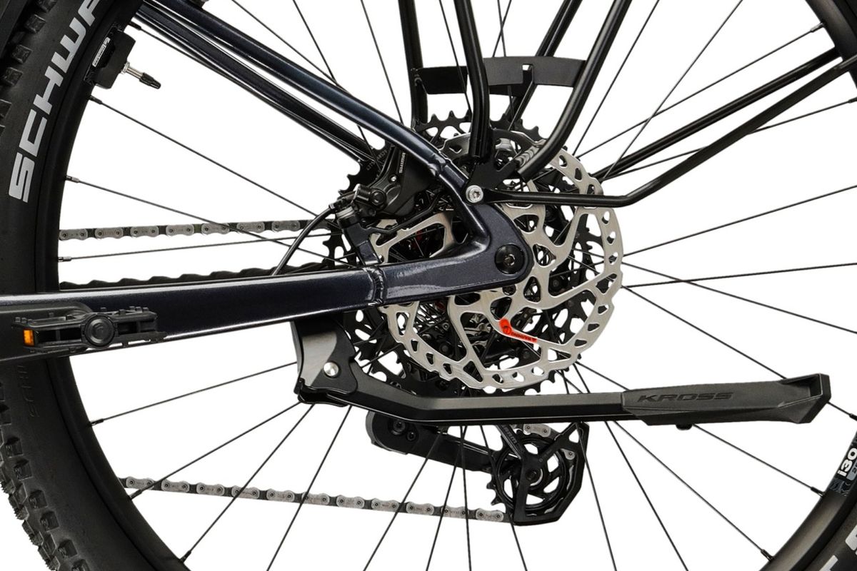 A hajtás az Influx Hybrid SUV 6.0 egyik legmodernebb része: SRAM S1000 Eagle AXS váltó és AXS Pod vezérlés, 1×12 sebességes rendszerrel, 10–52T tartományú kazettával és Transmission lánccal. Ez gyakorlatban azt jelenti, hogy nagyon széles az áttétel-tartomány, síkon is lehet vele tempózni, emelkedőn pedig a legkönnyebb fokozatoknál is marad tartalék – ráadásul vezeték nélküli elektronikus vezérlésű, gombnyomásra gyors és pontos váltásérzettel. A fékezést a Kross mérnökök a magas színvonalú Shimano MT420 hidraulikus tárcsafékekre bízta 203/180 mm-es RT66 tárcsákkal párosítva. Négydugattyús rendszerről van szó, ami elképesztő fékhatást nyújt. A távirányítással működő dropper nyeregszár teszi teljessé a komfortot és a kontrollt.