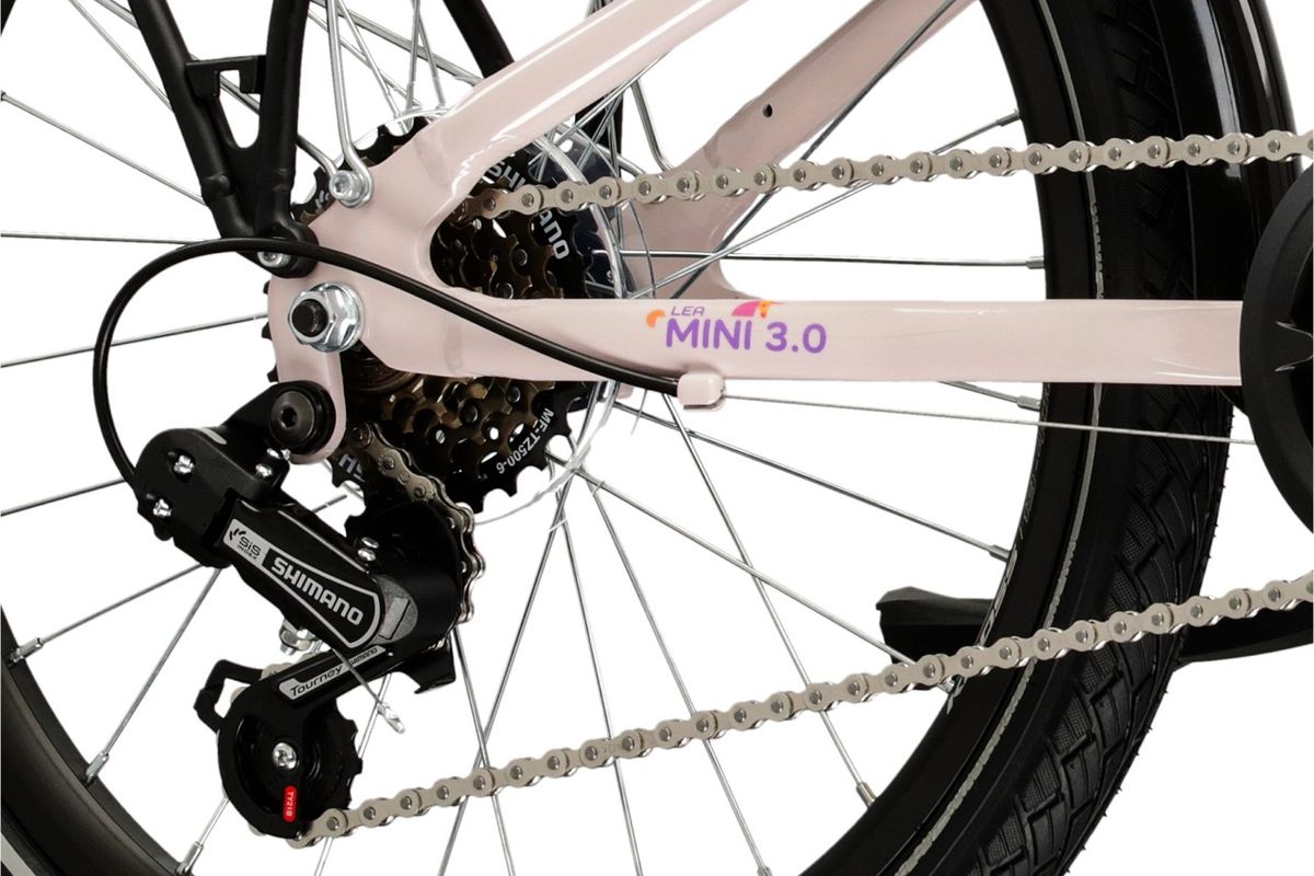 A LEA MINI 3.0 EQ 6-fokozatos Shimano TX váltórendszerrel érkezik. Ez a rendszer ideális gyerekeknek, mert egyszerű és könnyen kezelhető áttételeket kínál. A fékrendszer elöl és hátul egyaránt klasszikus V-fék. Ezek a mechanikus fékek alacsony karbantartást igényelnek és jól adagolható fékerőt biztosítanak, ami különösen fontos a gyerekek biztonsága szempontjából. A fékkarok könnyen elérhetők a kisebb kezek számára is, így a gyermek gyorsan megtanulja a fékezés helyes technikáját – ez az önálló kerékpározás szempontjából kulcsfontosságú.